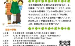 NPO法人ささしまサポートセンターでは、 生活困窮世帯等の中学生、高校生と一緒に勉強する“学習サポーター”を募集しています。 学習支援だけでなく、子どもの話を聴いたり、 子どもたちと一緒に楽しむイベン...