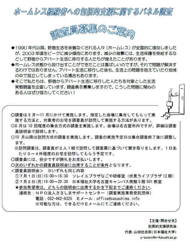 NPO法人ささしまサポートセンターは、日本福祉大学の山田壮志郎准教授、水谷聖子教授、 中部大学の吉住隆弘准教授らで構成される「包摂的支援研究会」の委託を受け、「ホームレス経験者への包括的支援に関するパネル調査」 を実施しています。