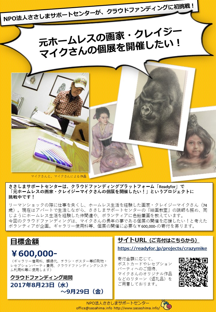 今回のクラウドファンディングは、マイクさんの長年の夢である個展の開催を応援したい!と考えたボランティアが企画。