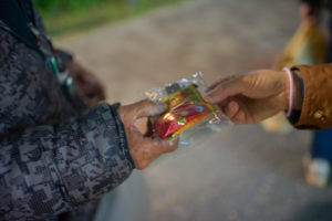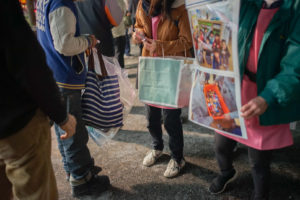 炊出しに並んでいる150名ほどの人々に、「保育園の子どもたちからのプレゼントです、よろしければどうぞ」と言いながらチョコレートを一袋ずつ渡していて、受け取る人の表情は綻んでいるように見えました。