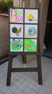 1日目はカフェ看板の絵の下書きをしました。子どもたちと戸谷さんがすっかり打ち解けたあと、2日目の午前中は木の板に実際に絵を描きました。初めてアクリル絵の具を使った子どもたちは、よく乾かしてからでないと重ね塗りができないと分かり、時間をかけて絵を完成させていました。