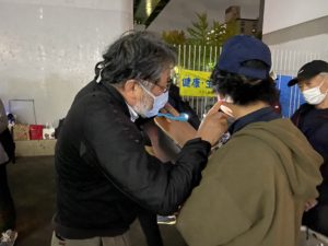 炊き出し相談では、毎週木曜の夜に開催される炊出し会場の一角をお借りして、生活や健康に関するお悩みなどを聞かせていただいています。