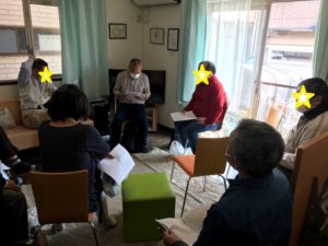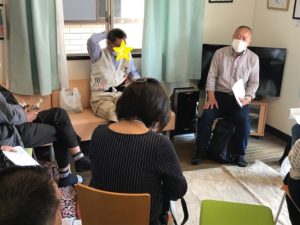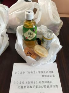 入口で検温して、手洗い(30秒)・うがいをし、手指消毒して、マスクを配り実施しました。いつもはみんなでお菓子をつまみお茶を飲みながらの学習会ですが、今回は席の間隔を空け、飲み物やお菓子は袋に入れて持ち帰ってもらいました。