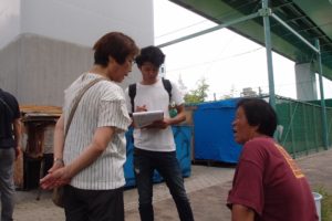 都心部や河川敷などを歩いて回り、野宿生活をしている方に困っていることがないか等を聞いていきます。巡回相談には看護師の資格を持つ人や、以前に野宿を経験して今はアパート生活をしている方など、いろいろな人がボランティアとして参加しています。